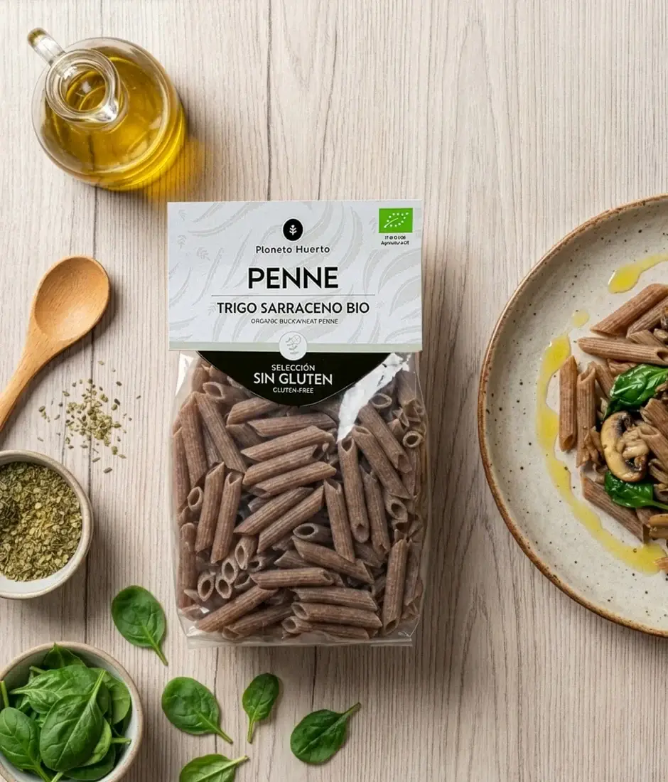 Pasta ecológica en formato penne elaborada a base de trigo sarraceno. Producto sin gluten, apto para personas con intolerancia al gluten o que buscan una alternativa vegetal y nutritiva a la pasta convencional. De sabor intenso y textura firme tras la cocción.
